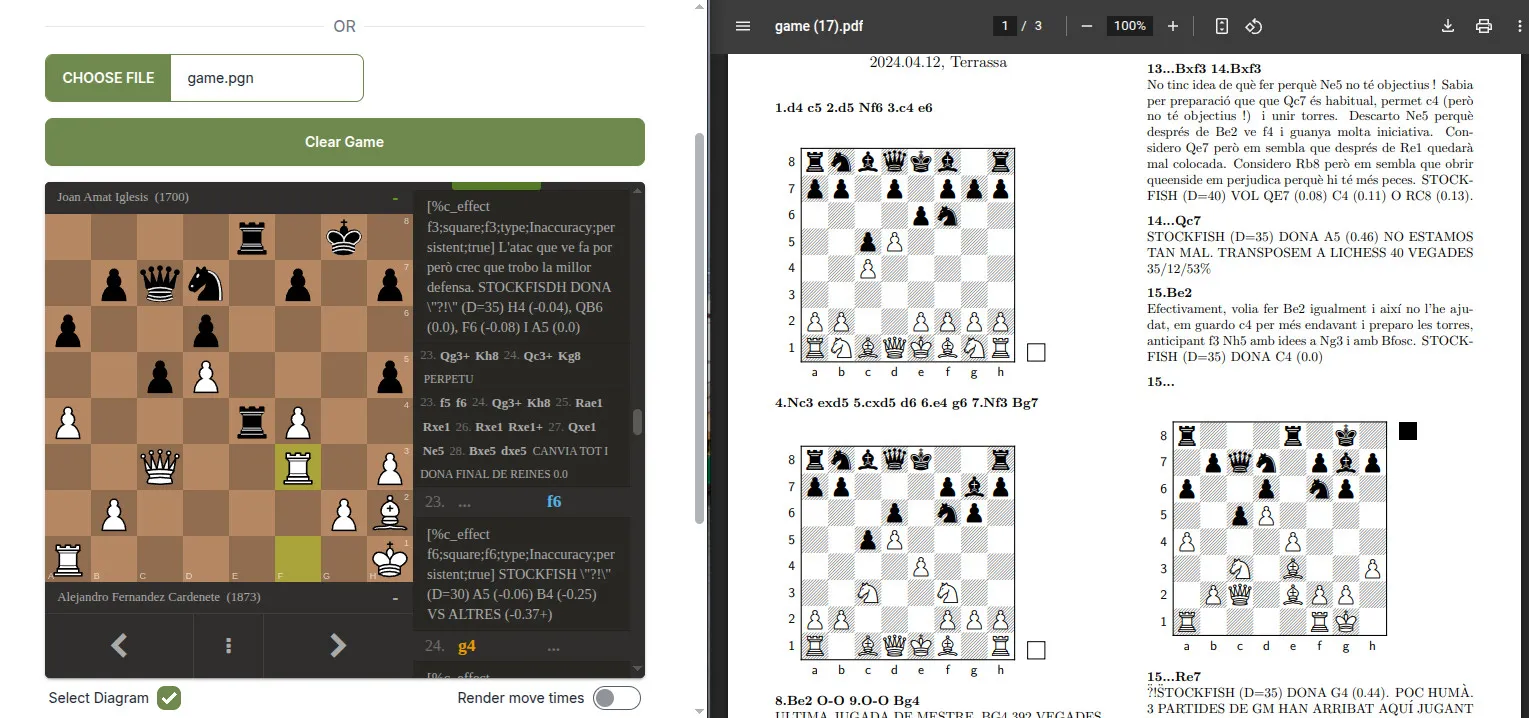 - Allow the user to choose which positions they want to display as an image on the PDF. Custom event listeners/handlers and DOM manipulation was used, tailored to match the chessboard position with the parsed PGN file object